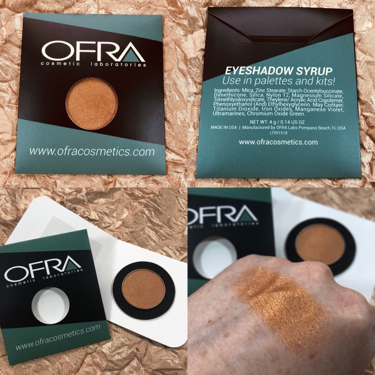 OFRA Cosmetics Eyeshadow Single in the shade Syrup (4 grams/0.14 oz; $15 USD). I like OFRA eyeshadows. I got another OFRA shadow single in an ipsy bag a while back. I can see why people like this brand. This is one of the full-sized products in my bag this time. This particular shade is a warm golden copper that looks great blended all over the eyelid in a single shadow look.