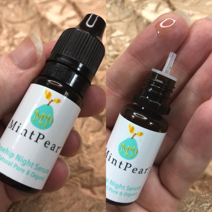 MintPear Rosehip Night Serum (0.27 fl oz; $49 USD for 1 fl oz./30 ml). I like facial serums. I’m not sure I like this. It has a great ingredients list: Organic cold-pressed rosehip seed oil, Jojoba oil, Pomegranate seed oil, Carrot seed oil, Red raspberry seed oil, Maraca (Passionfuit) seed oil, Tomato seed oil, Waterercress seed oil, Calendula + Lavender essential oil.