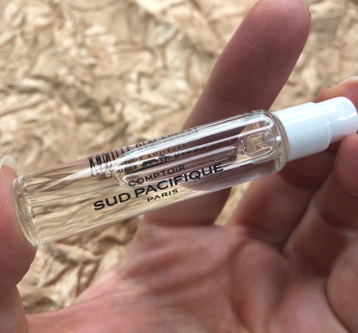 Comptoir Sud Pacifique Eau de Toilette in Vanille Blackberry (5 ml/0.169 fl oz; $23 USD for 0.3 fl oz). If you like light perfumes, you might like this. I did not. The 5 ml vial has a sprayer on it, so I didn’t have to fight to get a lid off like you sometimes do with perfume samples. I spritzed this on my wrist. It smelled okay at first, but it did not go well with my personal chemistry. For me, this is not something I would purchase a full size of.